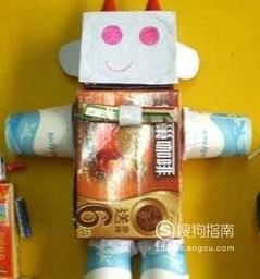 再用纸杯或长条状的纸箱,粘在身体的两侧和下方,当作机器人的胳膊和腿。纸箱玩具机器人就做好了。本来是没用的废纸箱,现在变成了孩子的玩具机器人。