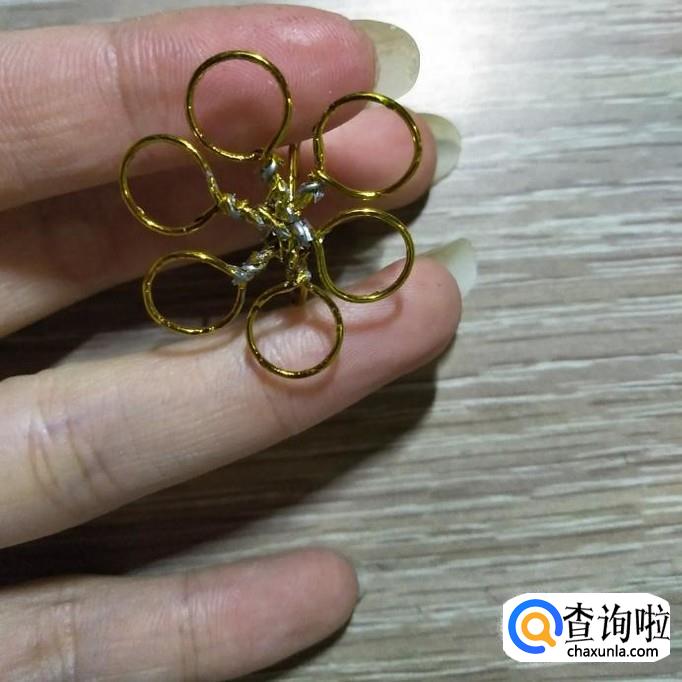接着我们用钢丝钳夹一下铁圈,使其先呈椭圆形,再夹住椭圆形铁圈的中部,向下按,使其成如下图一所示的形状,重复操作,将所有铁圈都做成花瓣型
