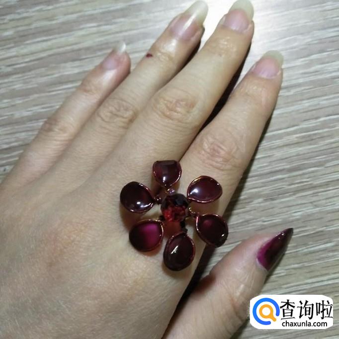 在刚刚做成了花瓣的中间滴上一滴指甲油,然后将红色的珠子放在其上,待其干,我们的首环戒指就做好了,如下图2,是不是很漂亮呢?