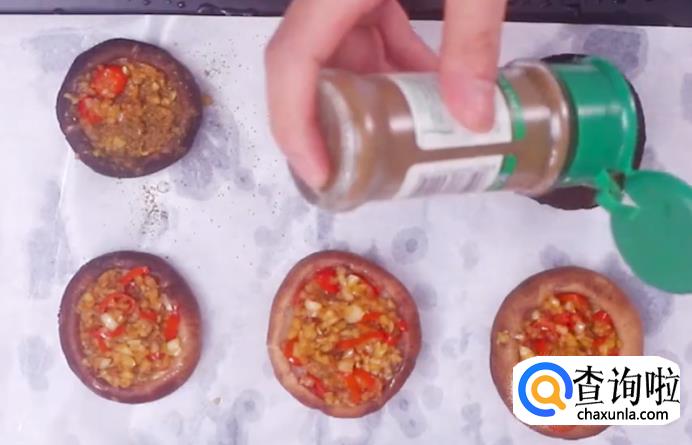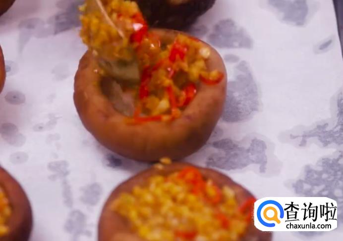 接着在香菇里塞满蒜蓉。如图所示。