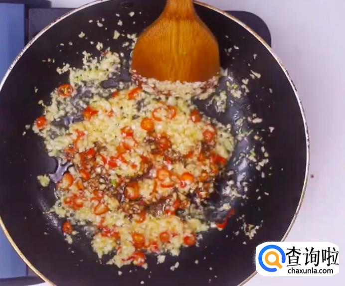 之后锅中烧热油,加入蒜末。如图所示。