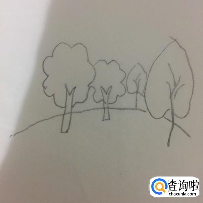 然后在几棵树之间画一条曲线作为水平线,如下图所示。
