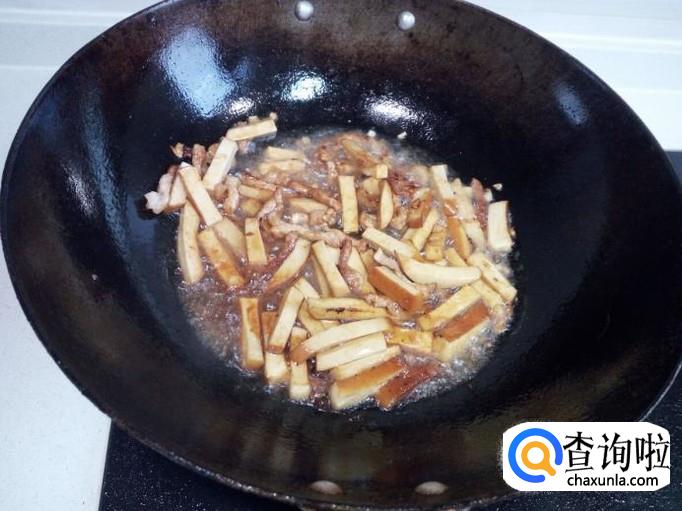 稍填入些水,这样炒的素鸡会软一下,然后放入豇豆快速翻炒,放入盐。