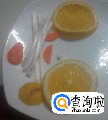 橙子切两个相等的圆型薄片,在切一个小一点的圆形薄片,胡萝卜如图切个半圆,再切一个大致相当于椭圆的形状。