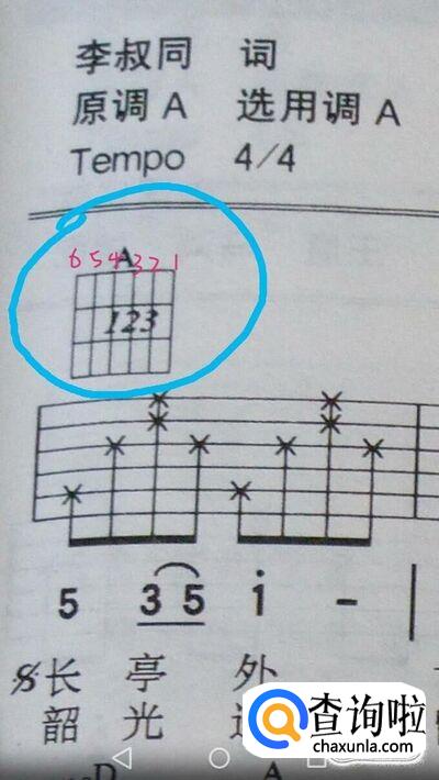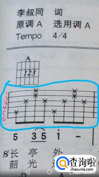 我在这里以第一小节为例讲解。下图蓝色圈起来的部分就是左手按弦的参照图,用红色标注的部分就是对应吉他的654321弦。参照图上的数字分别对应自己的手指,食指为1,中指为2,无名指为3,小指为4。