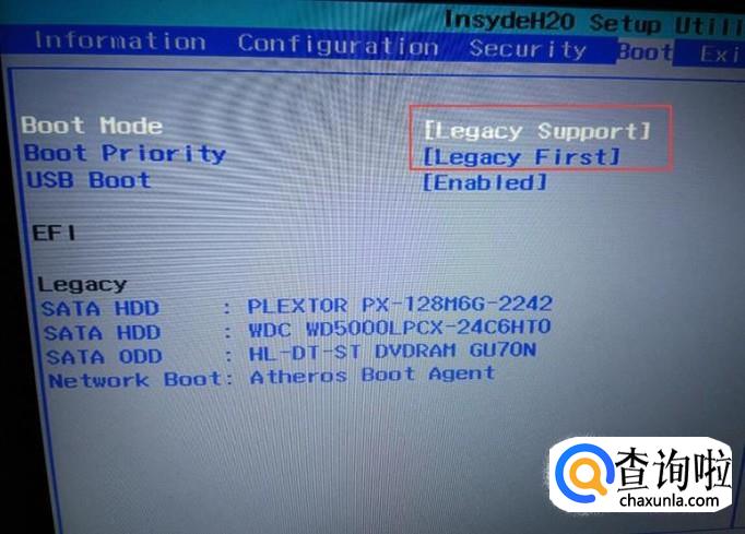 打开Boot页面之后,Boot Mode和Boot Priority都设置为Legacy first选项。