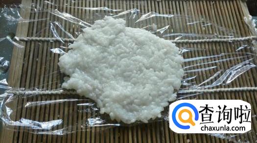 把鸡蛋与西红柿炒熟,放在摊平的糯米上,然后卷成圆柱体形状,这样糯米饭团就做好了。