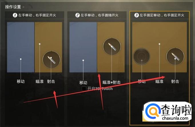 进入之后其实有三个操作的设置,一般情况选择第三个,手感好,而且操作很顺畅,有的人喜欢设置第二个,第二个的好处就是你可以边跑边瞄准射击。不过容易走火。