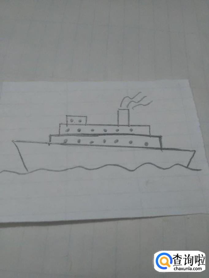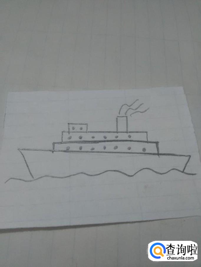 在长方形上方再画一个长方形,表示烟囱,在烟囱上方画三条曲线,表示冒出来的烟,轮船就画完了。