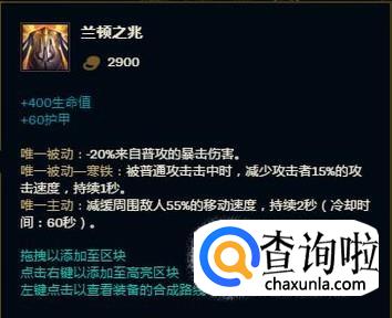 防御型的装备可以选择兰顿之兆,提高生命值与护甲,还可以减速敌方。