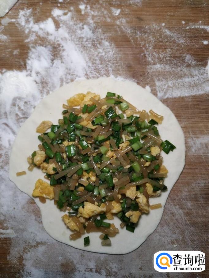 将做好的韭菜鸡蛋粉条馅放在面上,将另外一张面片盖在上面,用手将边捏好。