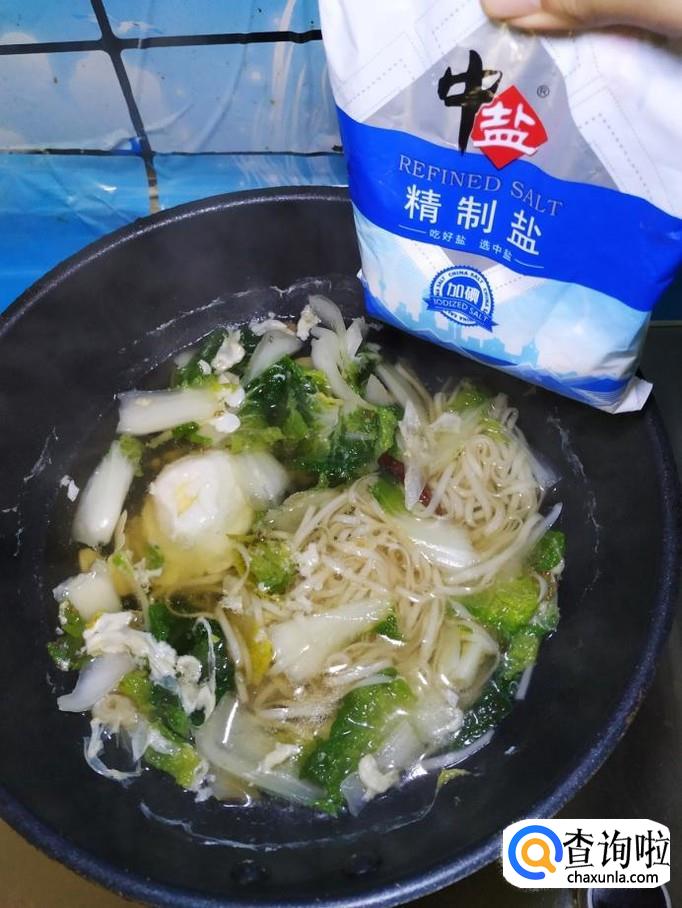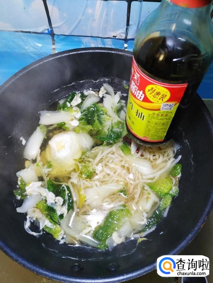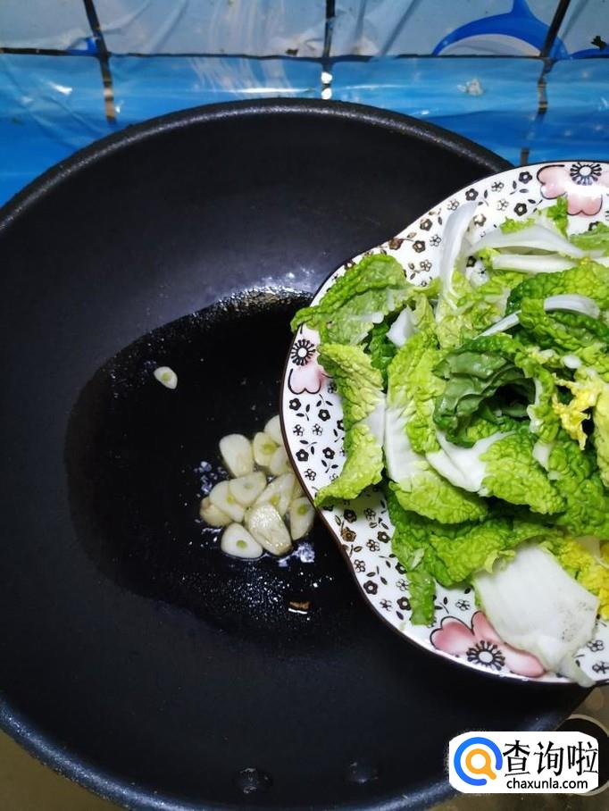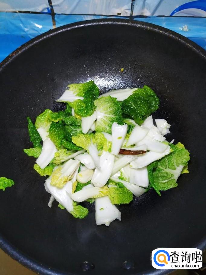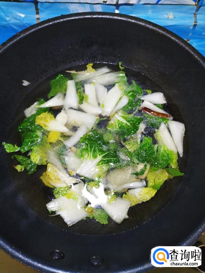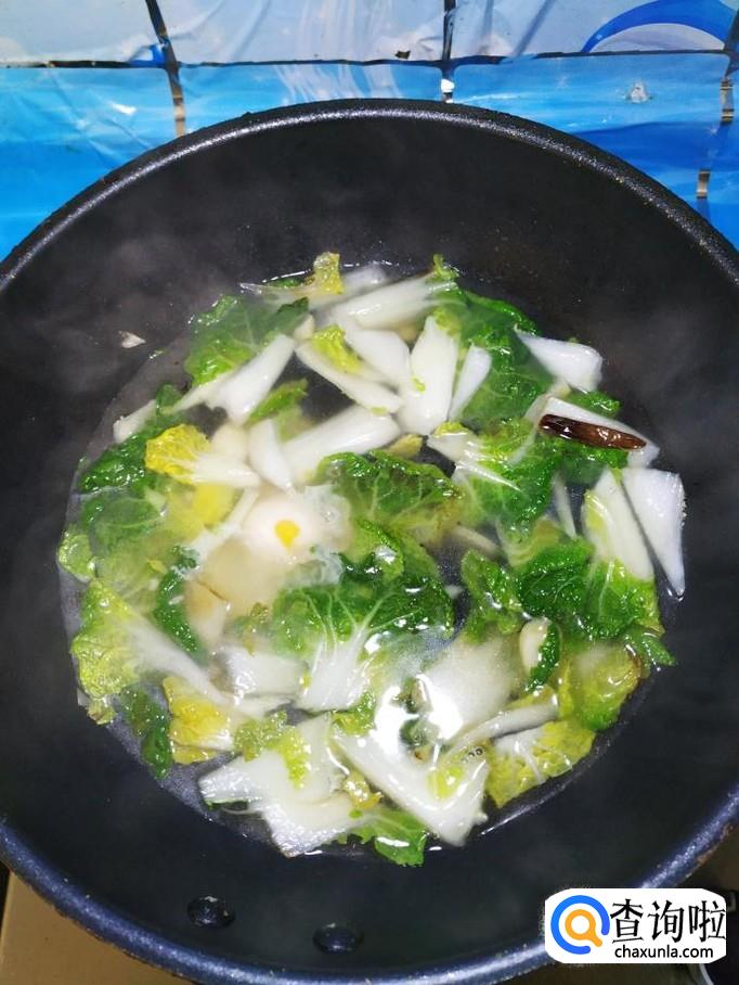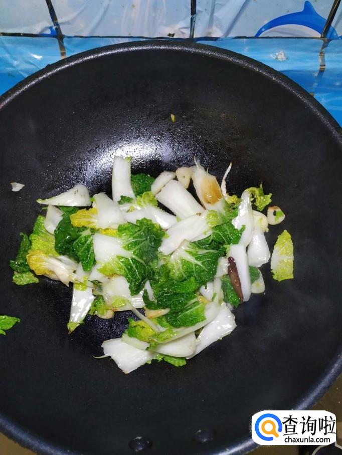 炒至乌塌菜开始变软,加入适量清水,大火将水烧开。