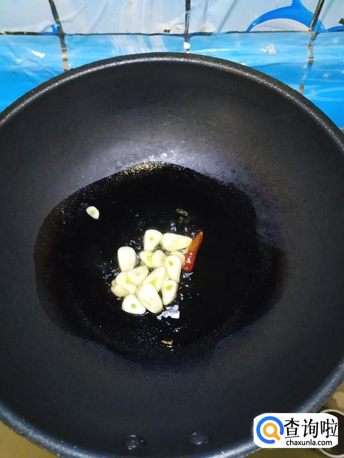 准备适量蒜,洗净后切片,炒锅中放入适量油,油热后放入蒜片和干辣椒,炒香,然后将乌塌菜倒入锅中,翻炒均匀。