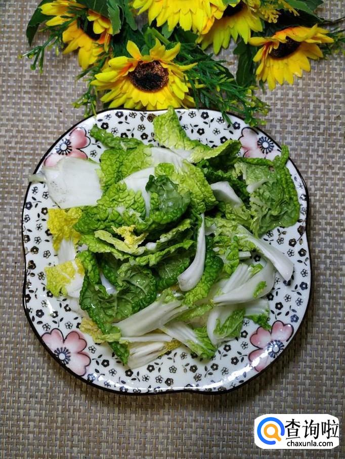 准备适量黄心乌塌菜,用手剥开后,洗去根部的泥沙,然后切成块,放入盘中备用。