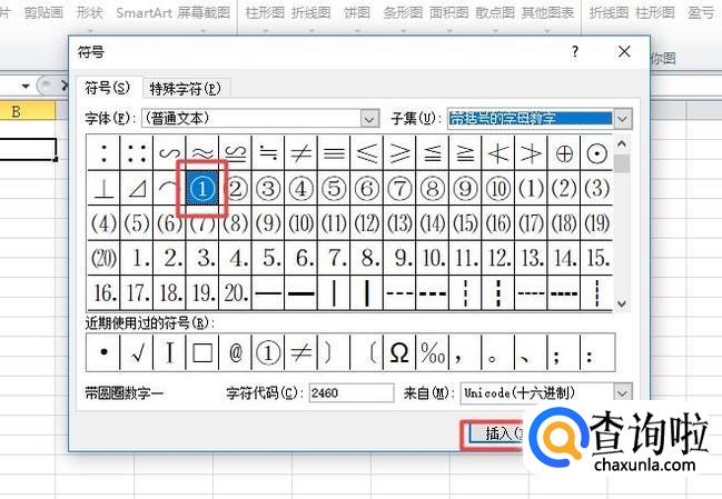 之后我们就可以看到带圆圈的数字了,我们选中1,然后点击插入;