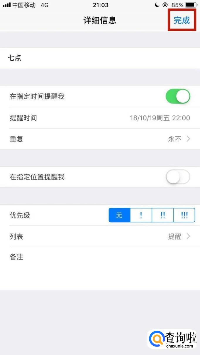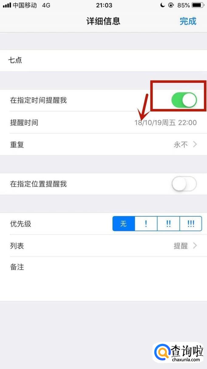 然后开启在指定时间提醒我开关并设置你想要的时间,如下图所示。