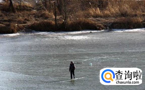 河道已经结冰的冰面,多数人贪玩走上去,但是有的地方冰面很薄,掉进去无法想象
