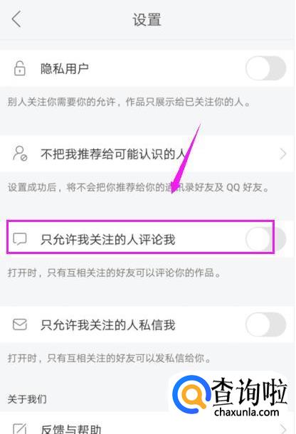 接着我们就会进入到设置页面,在个人界面,我们下拉,可以看到系统默认只允许我关注的人评论我是关闭的状态,如图所示。