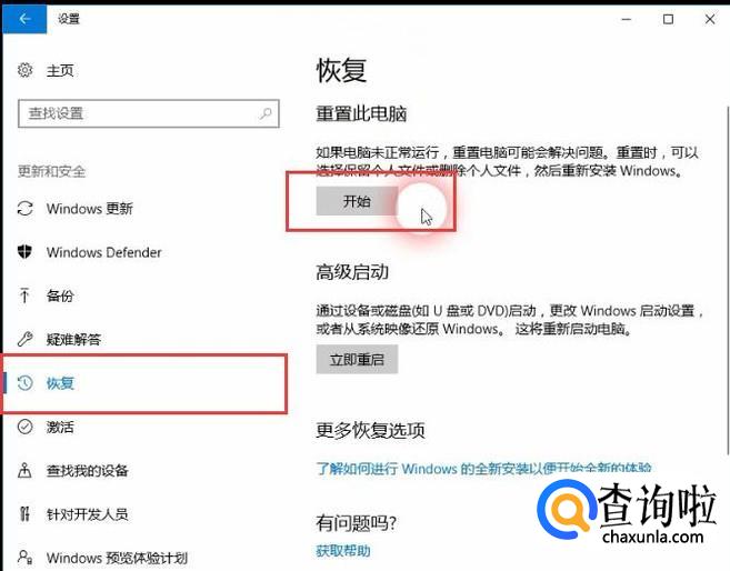 使用快捷键Windows+A,点击所有设置,点击更新系统-恢复,重置此电脑点开始。