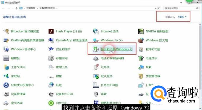 快捷键Windows+R调出运行命令,输入control,敲击回车,进入控制面板,查看方式切换至大图标,找到并点击备份和还原(Windows 7)
