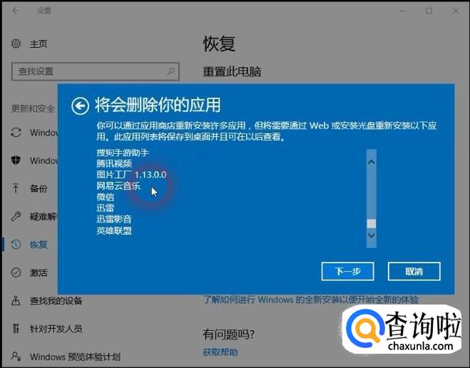 选择仅保留我的文件,删除应用和设置,提示窗口会显示出将被删除的应用,点击下一步,电脑重启、重置,等待完成即可。