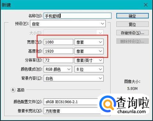 打开ps软件,新建一个文件,宽度和高度设置为和手机分辨率相符的数值,如“1920*1080”,分辨率为“72”,点击确定。