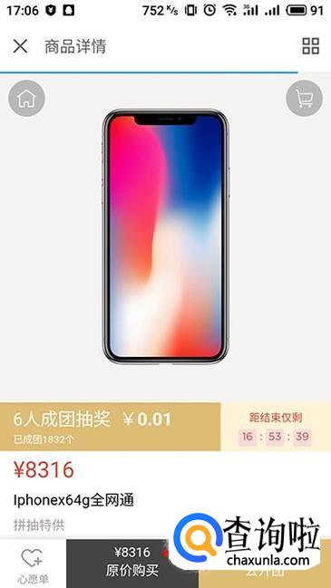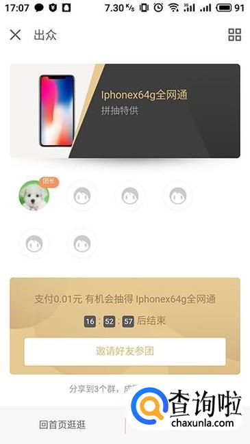 支付成功之后进行拼团详情界面,点击“邀请好友参团”来发送给好友,达到要求人数之后就能够成功参加抽奖活动了。