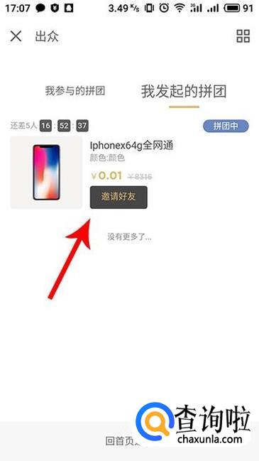 在“我发起的拼团”中,能够查看个人订单,点击“邀请好友”的话也能够进行分享。