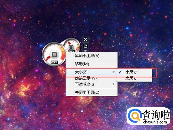 对着桌面显示的小工具击右键,然后可以设置小工具显示的不透明度比例等。