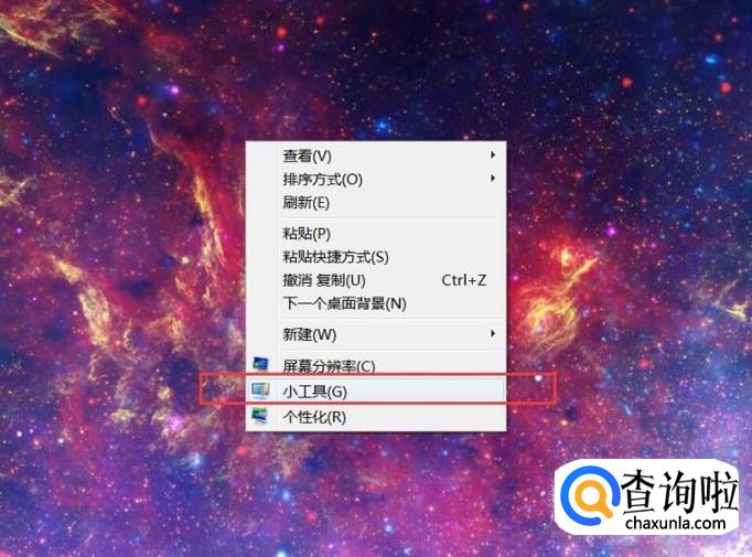 首先,我们在Win7系统桌面上击右键,选择“小工具”选项。