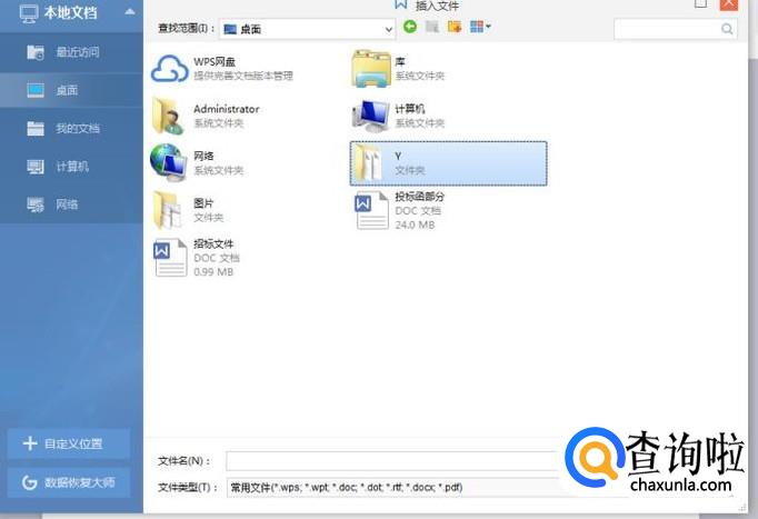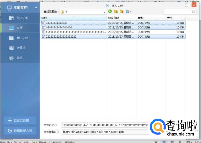 进入后,打开刚刚文件夹所在位置,点击此文件夹进入,选中需要合并的WPS文档后确定,刚刚打开的不用选中。