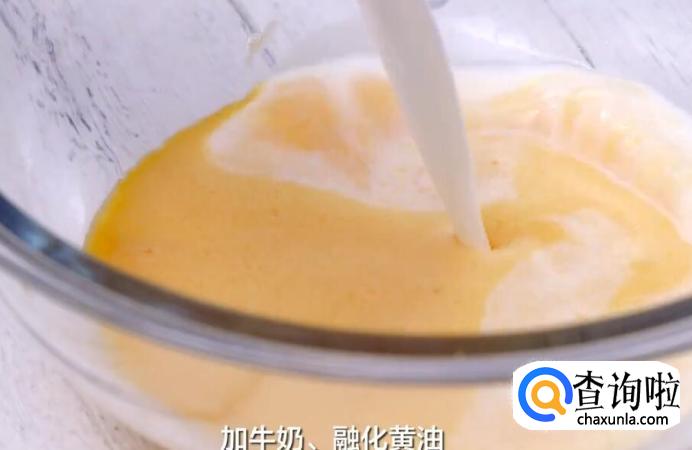 在打散的鸡蛋中加入牛奶和融化黄油,搅打均匀。