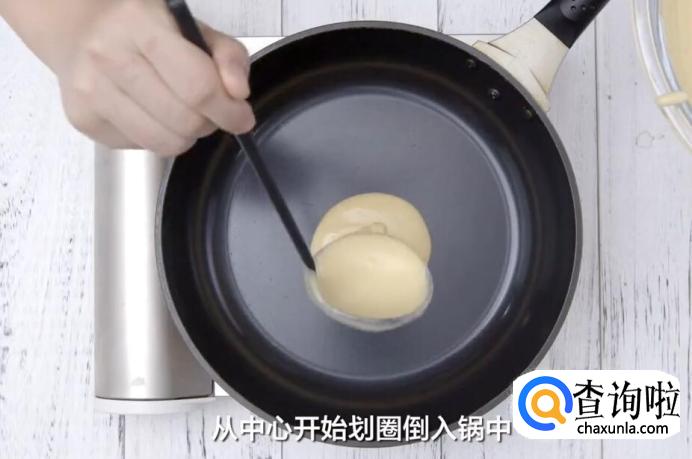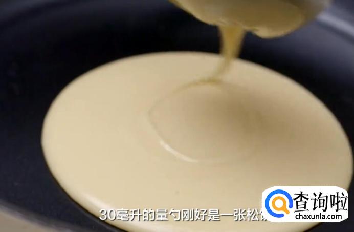 等锅烧热,用量勺舀一勺面糊,从中间开始划圈倒入锅中,30毫升的量勺刚好是一张松饼的用量。