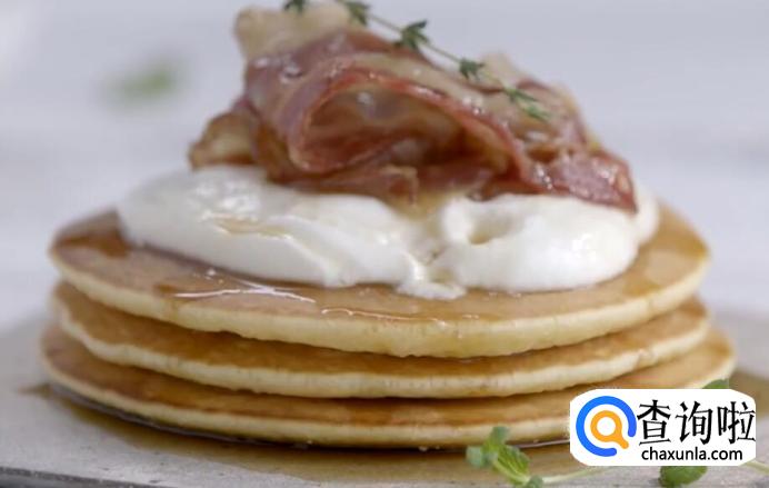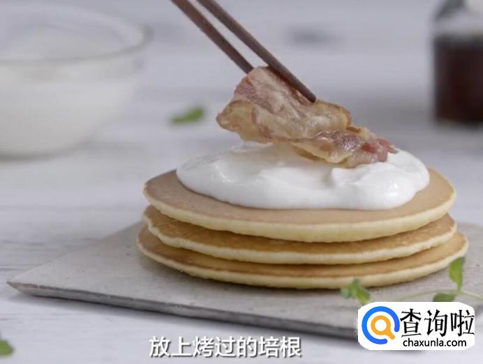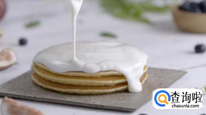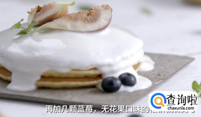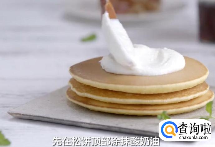 按照上面的步骤煎好松饼后,在松饼顶部涂抹酸奶油。