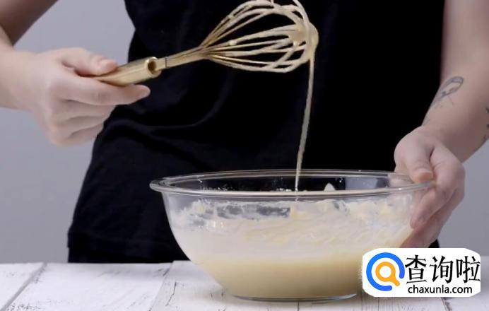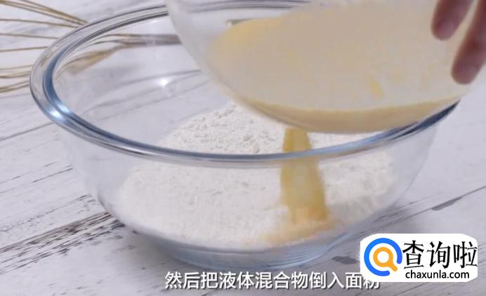 然后把液体混合物倒入面粉,搅拌至面糊状。