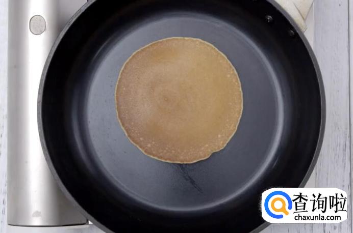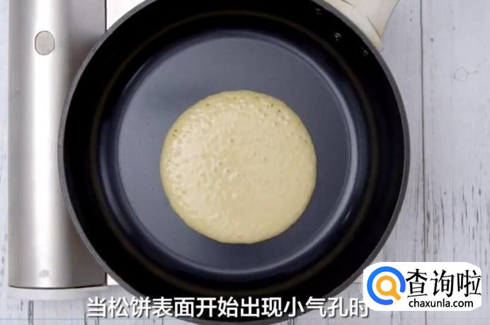 当松饼的表面开始出现小气孔时,翻面再煎30秒就可以出锅了。