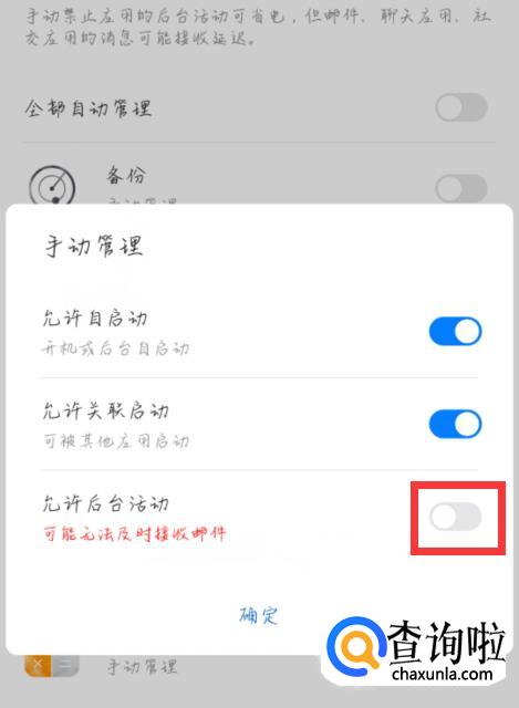 在一次点击电子邮件后面的会弹出一个勾选框,我们可以看到后台运行是没有允许的。