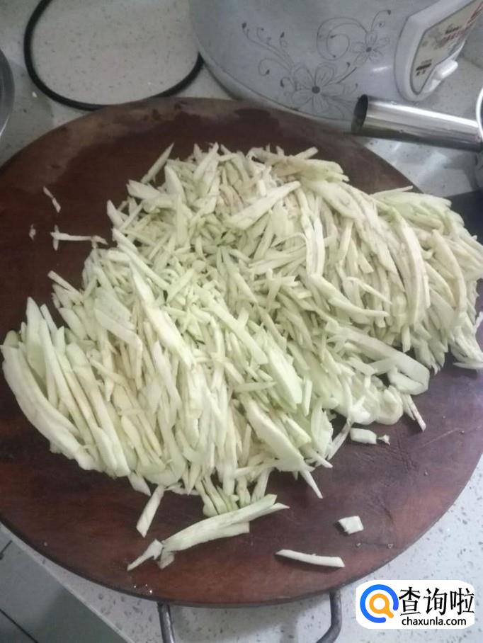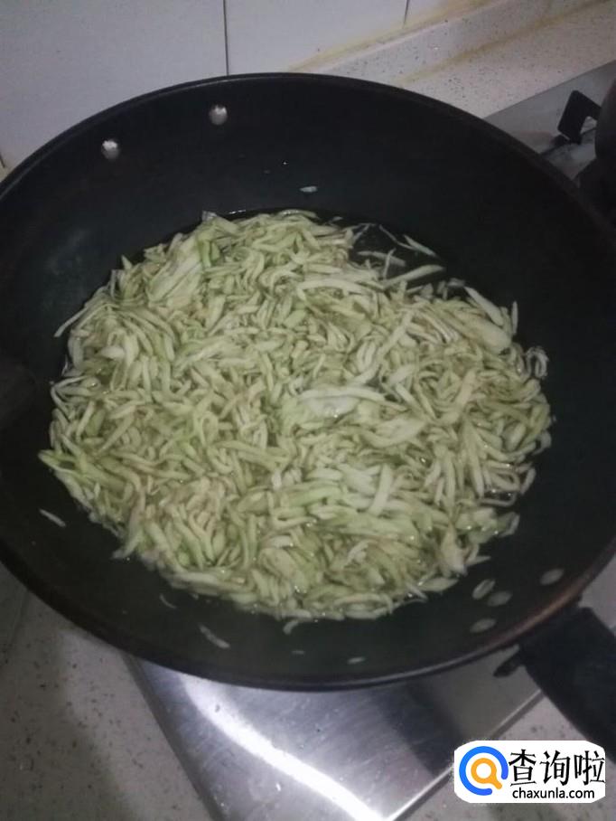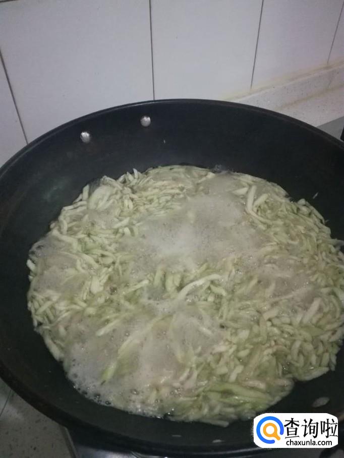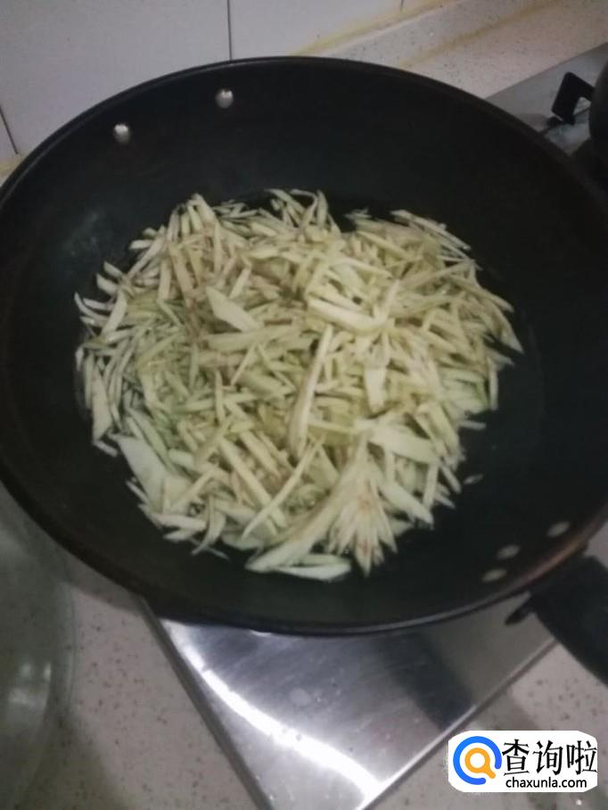 待水烧开后,将锅盖揭开,把切好的茄子丝倒入锅里,用铲子搅匀。