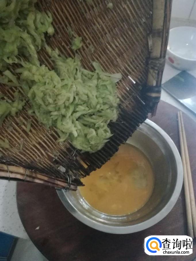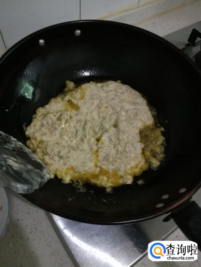 然后把调好的茄子鸡蛋面粉羮倒入油锅里。