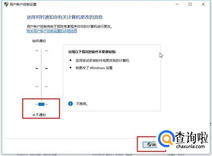最后,打开用户账户控制页面之后,将设置中的通知下拉杆调整为“从不通知”,然后点击“确定”按钮,即可避免提示窗口总是弹出的问题。