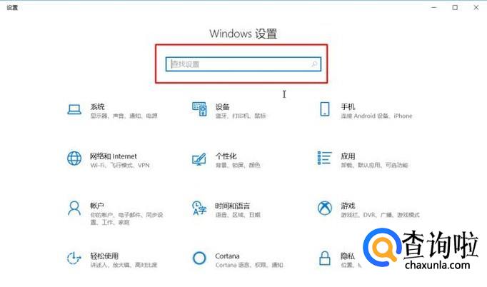 打开Win10系统设置页面之后,点击页面顶部搜索栏。