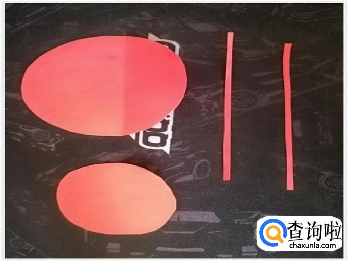 在两张彩纸上分别画一大一小圆,和2个细条(分别是做触角和绑定它们的辅助条)。再把它剪下来。如图所示。
