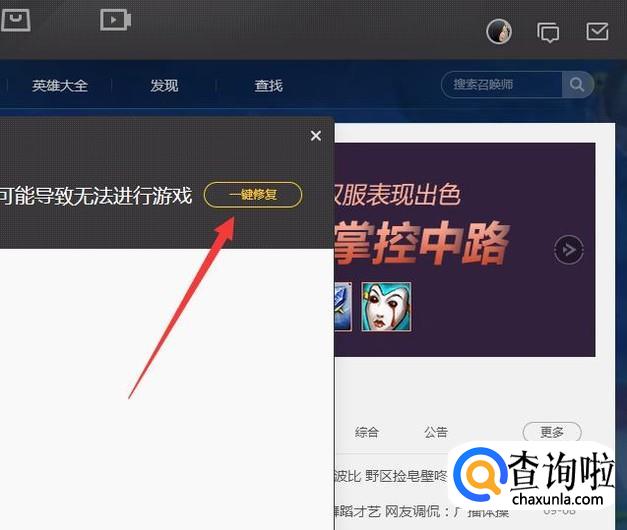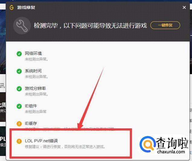 修复之后你看到已经检测出问题了,最后一个就是无法登陆的原因,然后点击一键修复,然后开始游戏就可以了