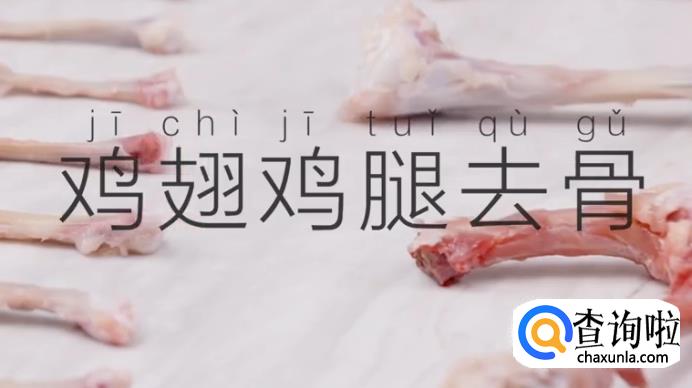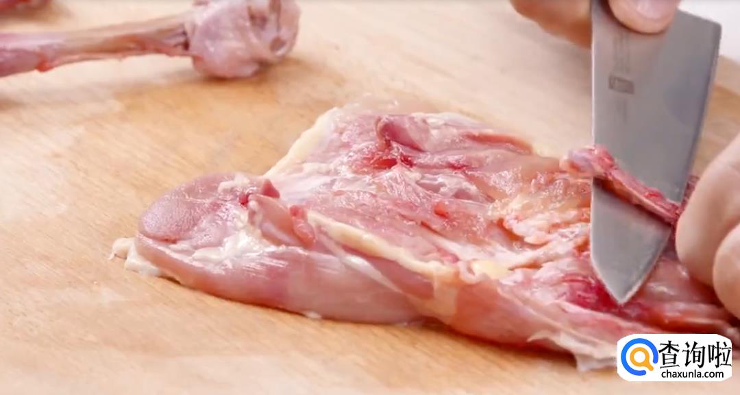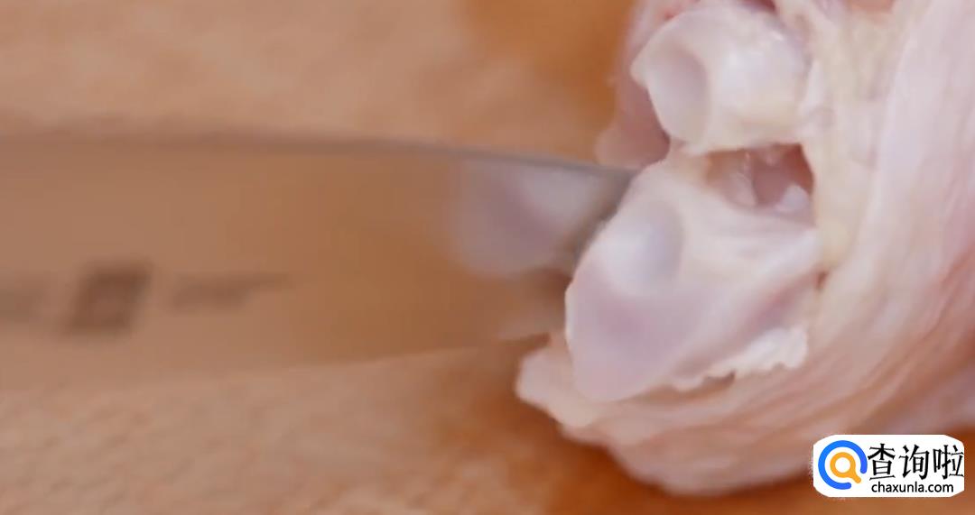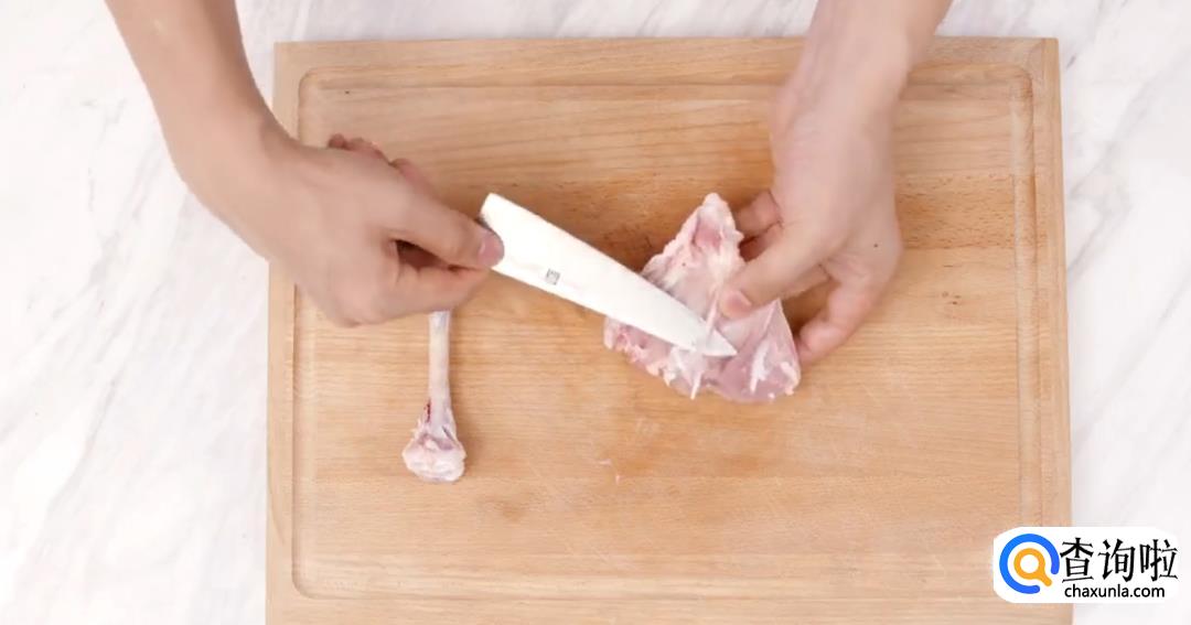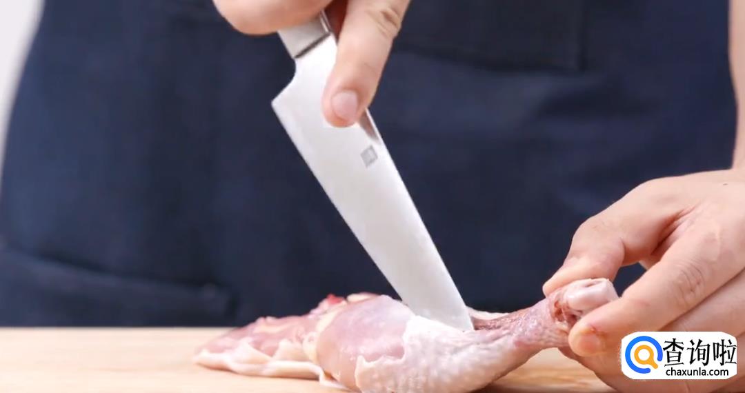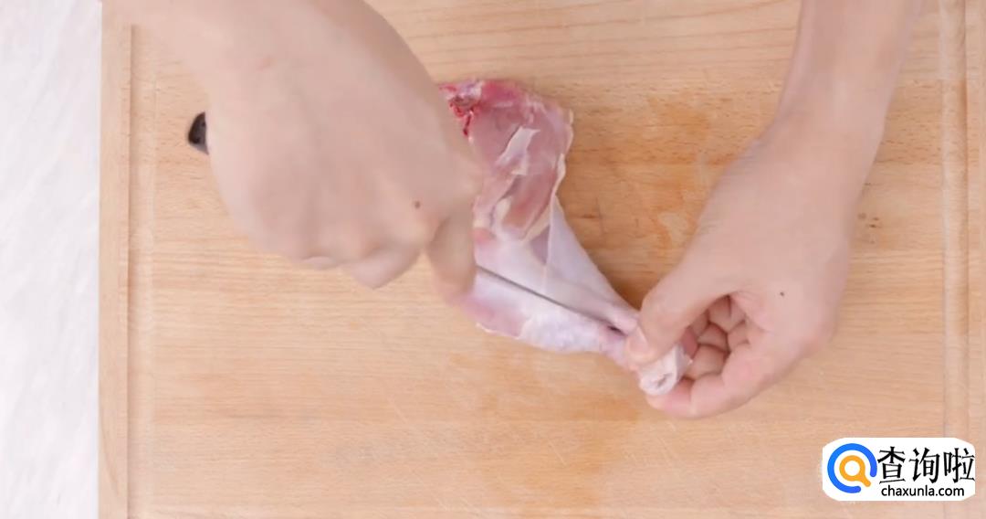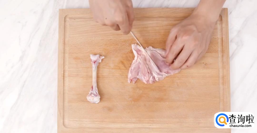 提起鸡腿,剔除鸡骨。