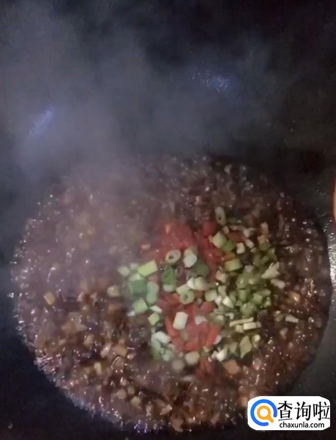 再放入葱花跟青红辣椒丁,倒入适量的水淀粉勾芡一下,备用