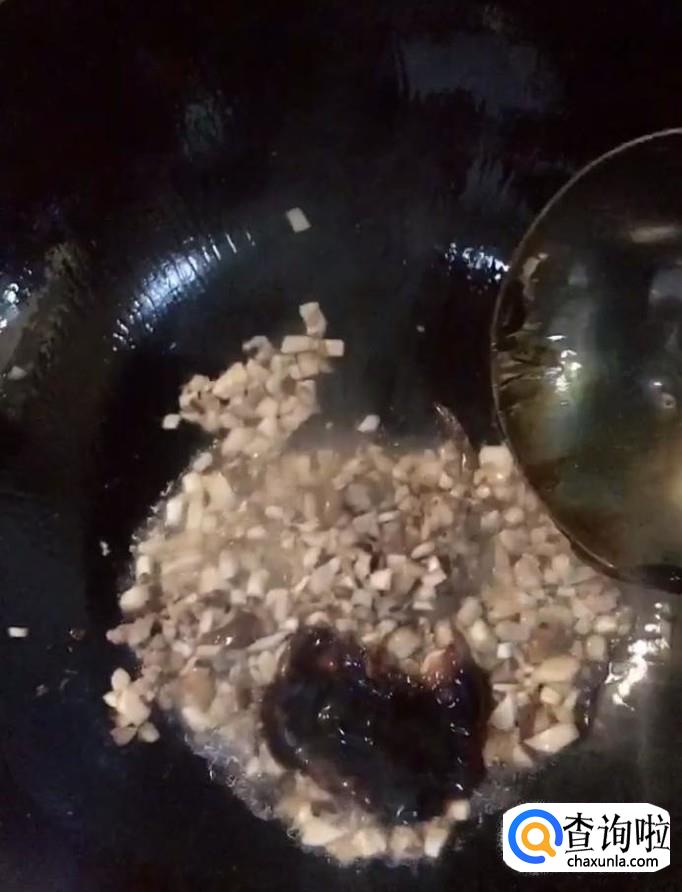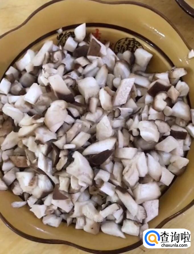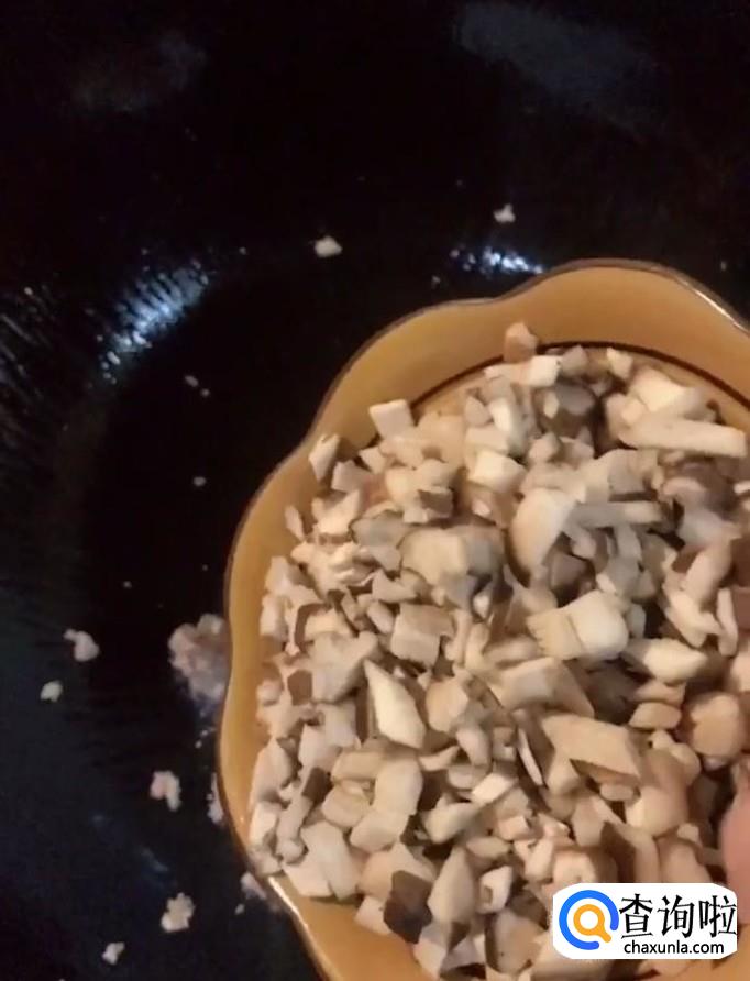 接着我们在锅中放入少许油,油热放入肉泥,翻炒一下,倒入准备好的香菇,翻炒均匀