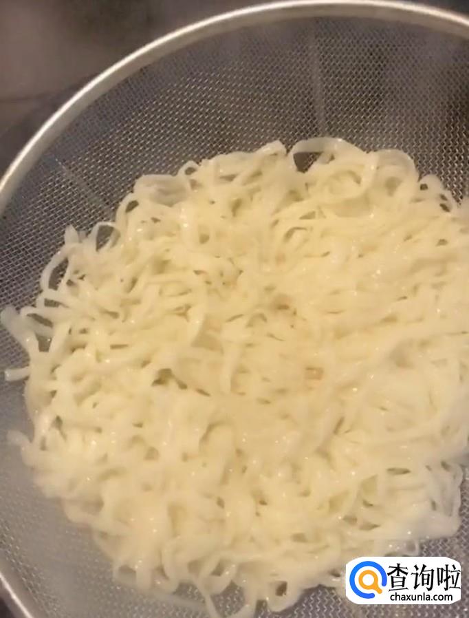 然后我们再清洗干净锅,放入适量的水,水开下入手擀面,煮熟捞出,过凉,控干水分倒入碗中