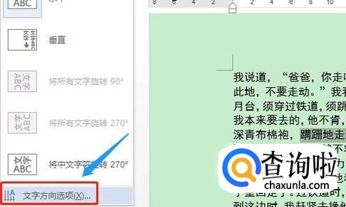 接着依旧在刚才的“文字方向”下拉菜单里,不过这次我们点击“文字方向选项”,然后在文字方向对话框,选中竖排的三种形式之一,点击确定以后效果如图所示,我们看到只有刚才被选中的文字方向改变了;
