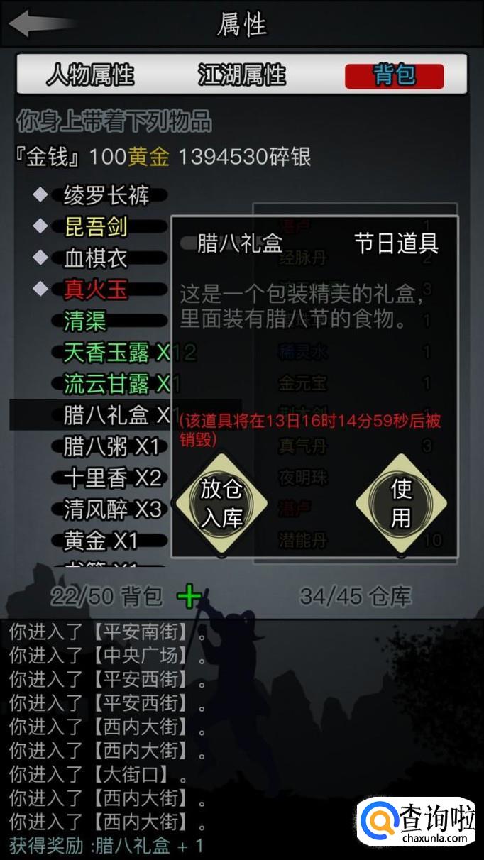 这时候我们再回到历练,提交任务就可以获得一个腊八礼盒,点击使用就可以开出各项道具了。