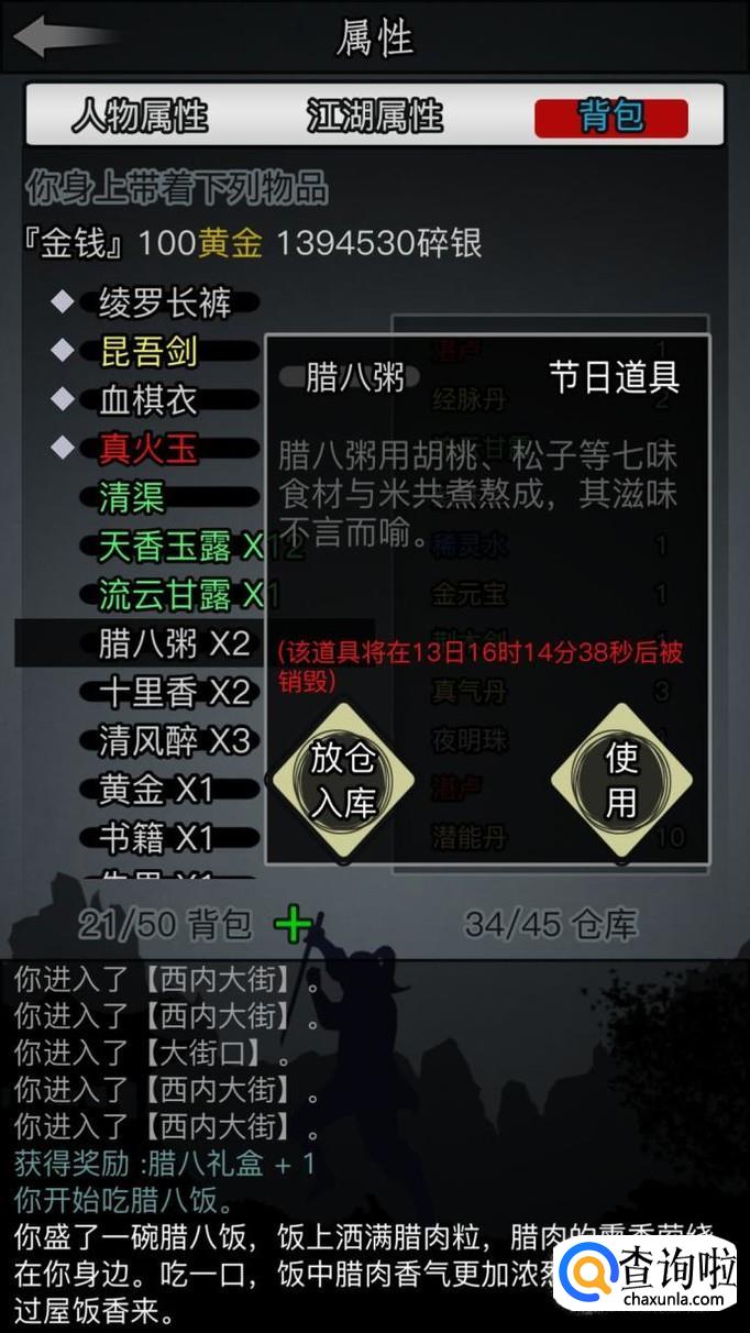 如果有多余的腊八粥,我们还可以直接把这个腊八粥吃掉,点击使用,可以增加经验值。